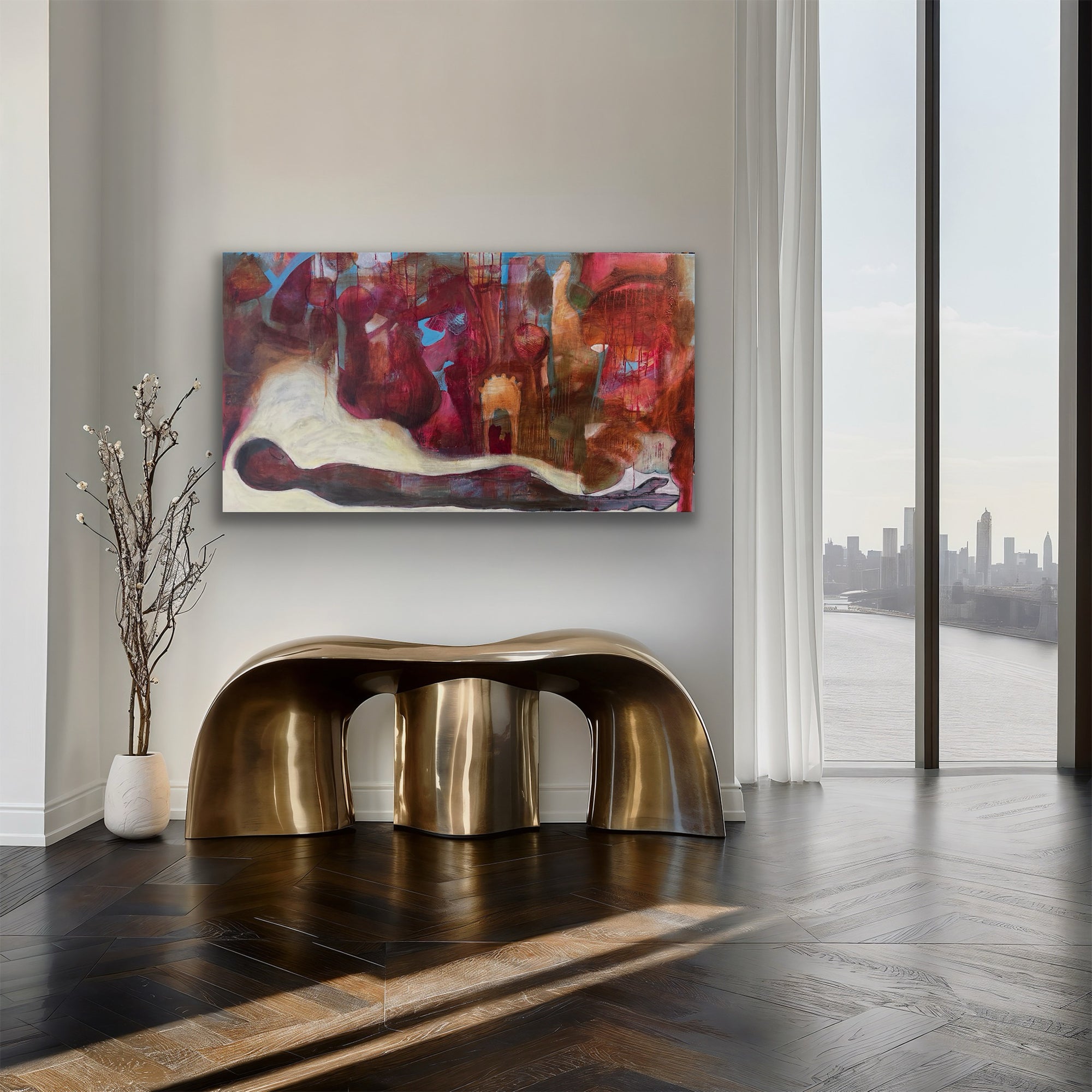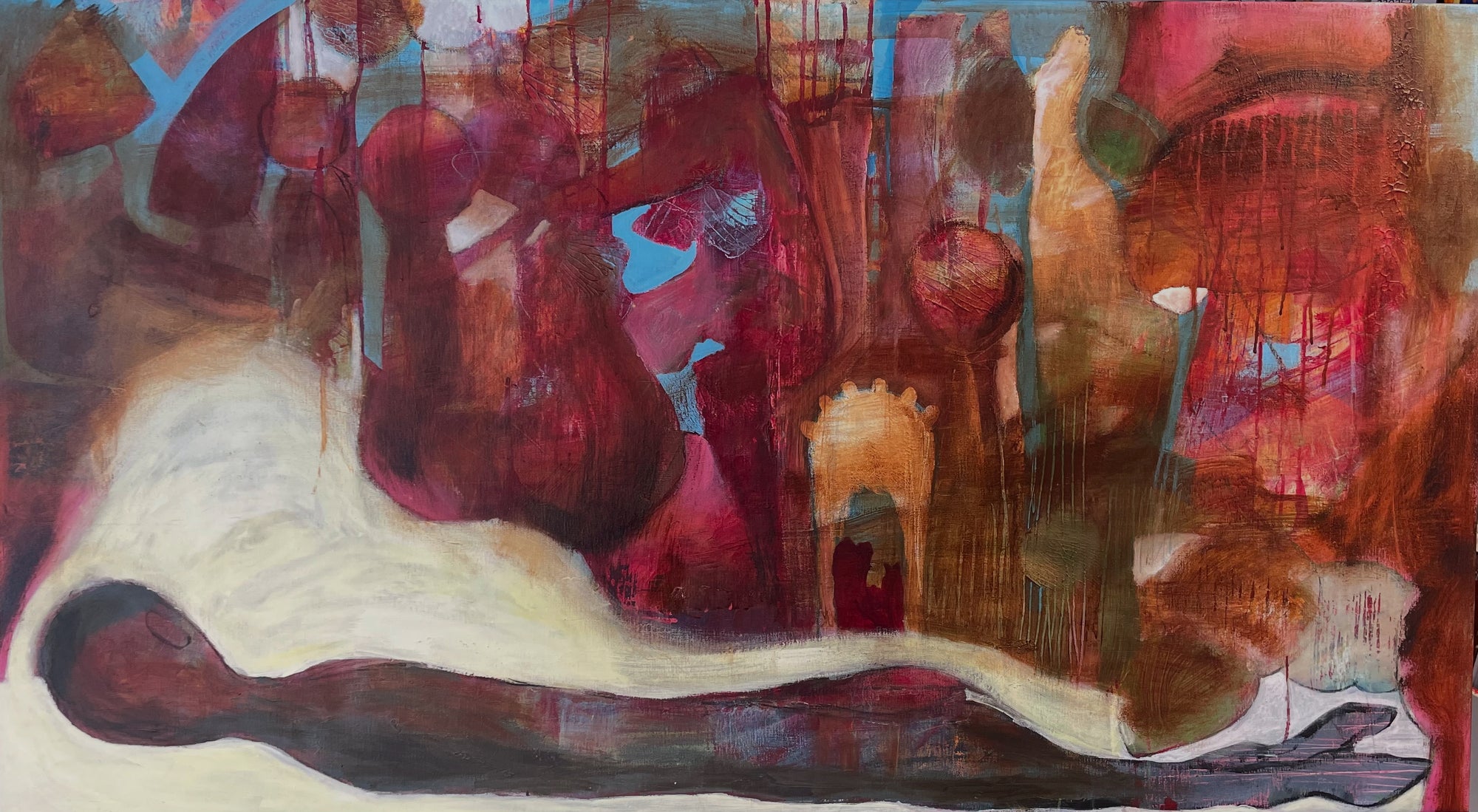 I detta verk har jag hällt ut råa känslor i en surrealistisk värld. Den långsträckta figuren förkroppsligar sårbarhet och vila mitt i ett turbulent, symboliskt landskap. Med hjälp av fylliga oljefärger och uttrycksfulla penseldrag har jag skapat ett drömlikt rum som inbjuder till djup reflektion och stillhetens helande kraft – ett kraftfullt andetag i en kaotisk värld. Denna målning ger varje rum en djup lugn och eftertänksam energi.